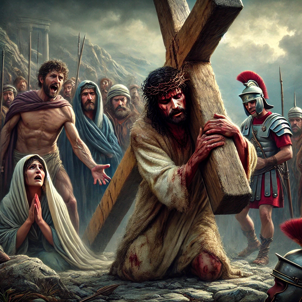 痛苦四端 「耶穌背十字架上山」 耶穌自己背著十字架出來,到了一個名叫「髑髏」的地方,希伯來話叫「哥耳哥達」。 (若十九:17) 有許多人民及婦女跟隨著耶穌,婦女搥胸痛哭他。 (路二十三:27)